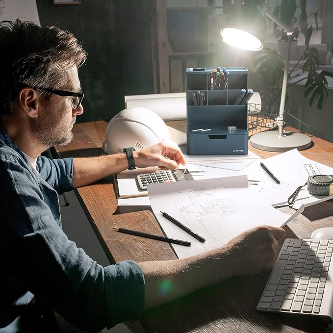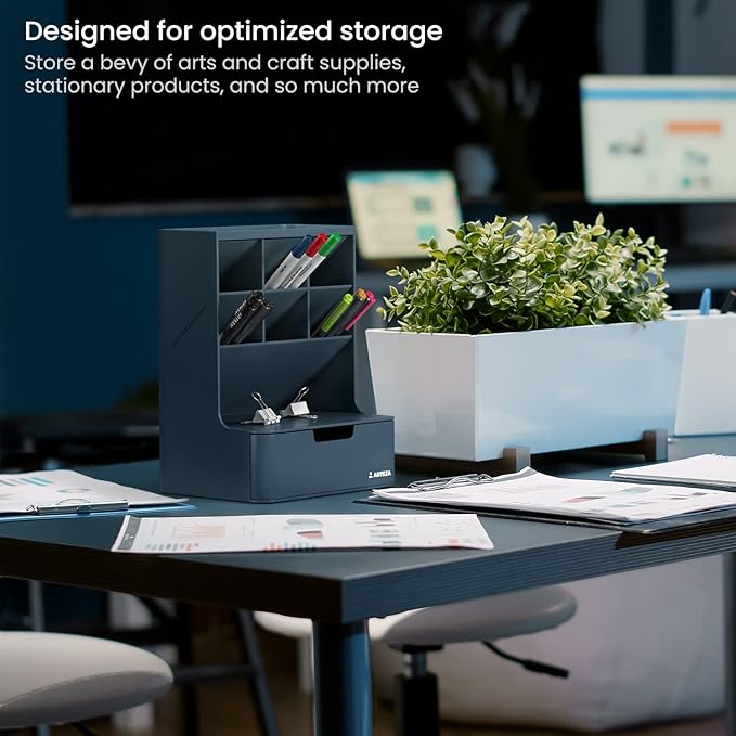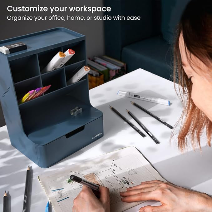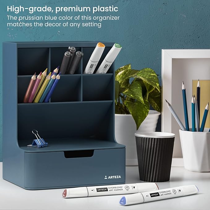ARTEZA Desktop Pen and Marker Organizer – 6-Compartment Blue Holder with Drawer for Desk, Office, Makeup, and Art Supply Organization