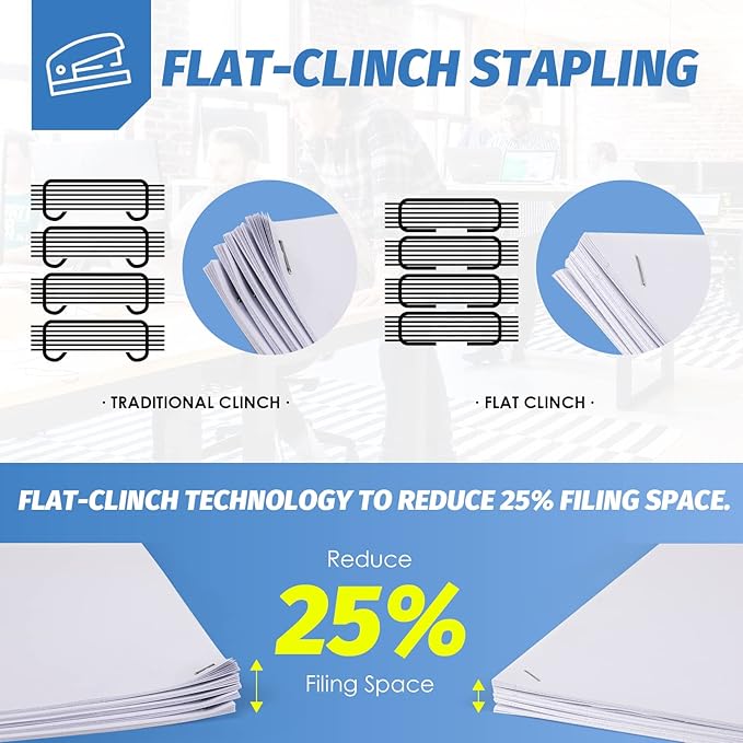 - Flat-clinch Design- This electric stapler uses the flat-clinch binding technology, which can save 25% filing space compared to traditional staplers, and the binding is neat on the front and flat on the back.
