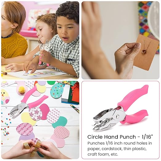 - DURABLE METAL CONSTRUCTION: Handheld single hole punch is made with all-metal construction and features an anti-slip soft rubber grip. The hole puncher is ergonomically designed with cushioned grips which are more comfortable for frequent use. Punches 1/16 in round holes in paper, thin plastic, foam, cardstock, etc.