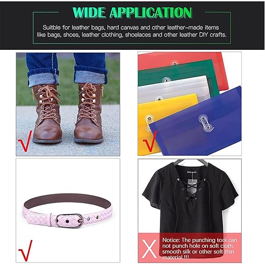 - 2、Suitable for sealing and perforating leather and paper. Clamp tool can press eyelets into a variety of materials such as fabric, leather, belts, plastic, acrylic, canvas, suede, paper, cardstock, leather, tents, awnings, canvas, tarps and other cloth items .