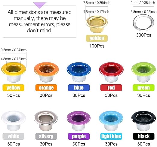 - 3、Comes with 400 sets of 3/16" 5mm metal grommets in 11 colors.