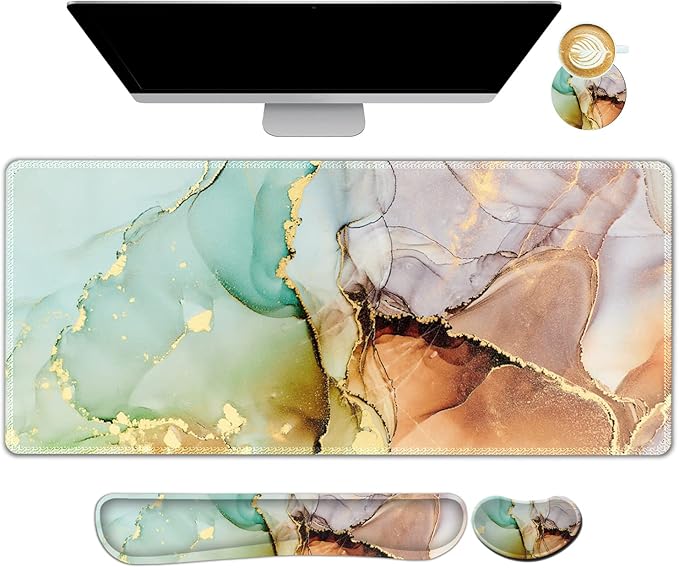 ARTSO Large Gaming Mouse Pad, Keyboard Wrist Rest Pad & Wrist Support Mousepad Set, Stitched Edge, Extended, Non-Slip Base, Memory Foam Desk Mat for Office, Home, Abstract Art Marble