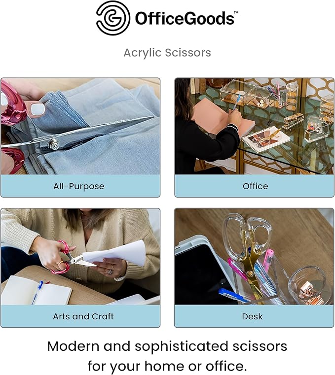 - Cut and craft with style - Cut in style with OfficeGoods Acrylic Scissors. Not just for arts and crafts, these sharp scissors for the office can also cut non-paper products, like ribbon, twine, and more.