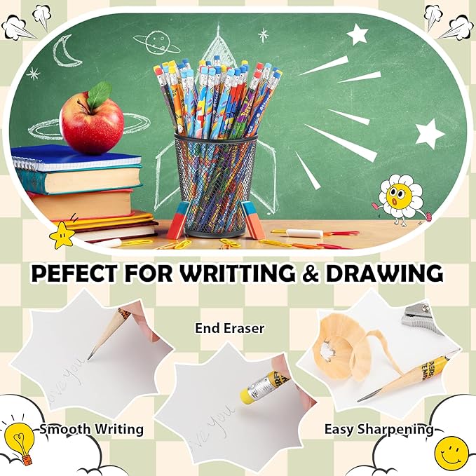 - Adequate Quantity: you will receive 72 cool attendance pencils with 4 different patterns, 18 of each pattern, 19 cm/ 7.48 inches in length; Each pencil comes with a cute eraser cap (random), plenty of quantity and style to meet your reward needs and use needs