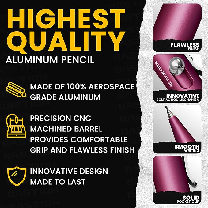 - Sturdy Lightweight Pencil: The heavy-duty metal construction guarantees quality that lasts a lifetime. Made of 100% genuine aluminum that is resistant to corrosion ensuring lasting durability. The lightweight construction allows you to draw, write, and sketch smoothly and comfortably. DOES NOT COME WITH ERASER