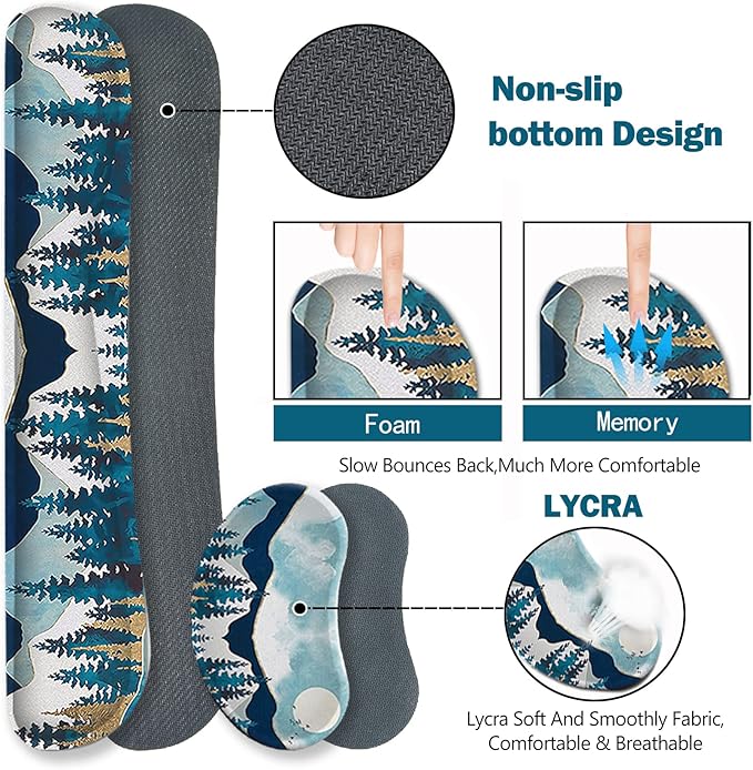 - 【Ergonomic Design】Designed with memory foam and soft smooth material to the pads, lightweight comfortable and durable for your daily work life. This gaming mouse pad wrist support set is contoured ergonomically to keep arms, wrists, and hands from getting sore while working and gaming for long periods of time, maximum reduce wrist stress and tiredness.