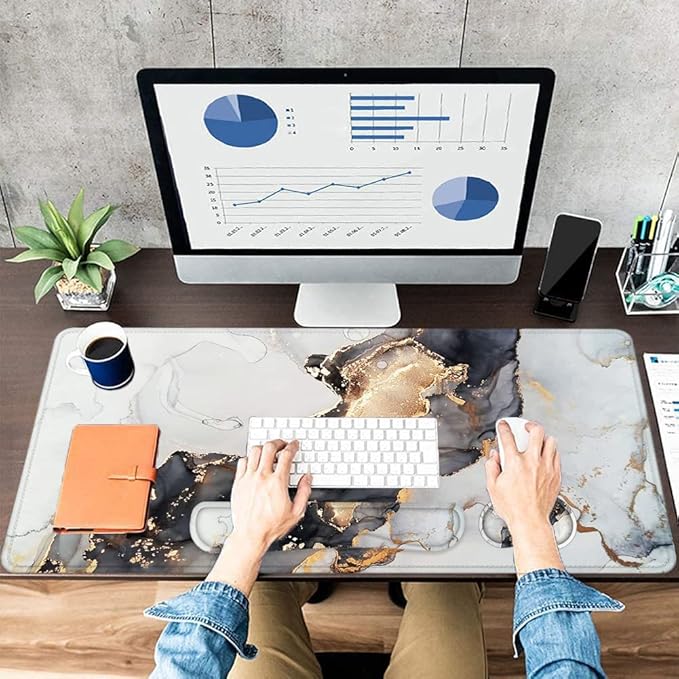 - 【Mouse Pad with Wrist Rests Set】Our large mouse pad and wrist rest set includes desk pad (35.4x15.7 in), keyboard wrist rest(16.9x3.5inch), mouse wrist rest(5.5x3.1inch), cup coaster(3.9x3.9inch). No need to buy them separately, at a super cost-effective price. This desk pad for keyboard and mouse is large enough to fit your mouse, gaming keyboard, and other desk items. Our desk mouse pad can keep a clean, uncluttered desk to improve the gaming experience or work efficiency in the office.