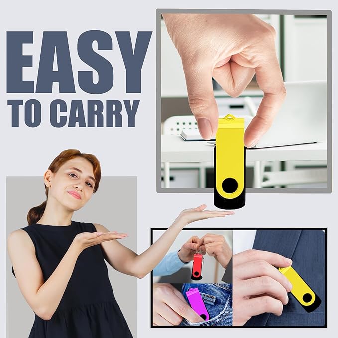- PLUG AND PLAYl : 32GB USB flash drives are lightweight and easy to use. USB 2.0 ensures fast read/write speed with no need to install a driver. Perfect for quick data storage and transfer. These memory sticks provides ample capacity for files, photos, and music. Each USB stick features a 360° swivel cover to protect the connector and an eyelet for attaching to keychains, backpacks, or lanyards. Take your data anywhere safely and easily. Compatible with computers, TVs, speakers, notebooks, and car