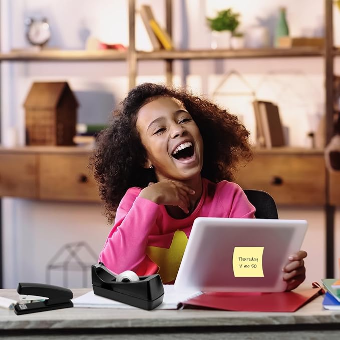 - Practical Combination: you will receive a black desktop accessory kit, including 2 pieces small office staplers, 2 boxes staples, each box has 1000 pieces, 2 pieces tape dispensers, 2 pieces tapes, 2 pieces pop up notes dispensers, 6 pieces sticky notes, totally 16 pieces, enough for you to use