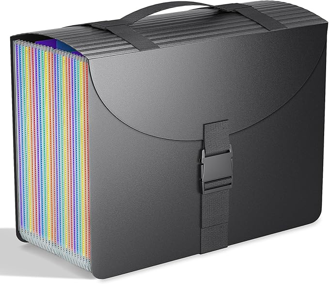 Marati 25 Pockets Expanding File Folders with Handle,Accordion File Organizer,Portable Filing Box,Colored Tabs for Document Paper,A4/Letter Size,Black