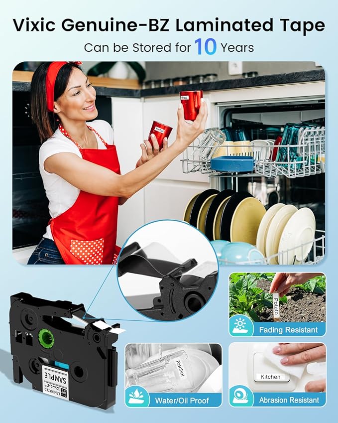 - Durable Laminated Labels for Home and Office: Label maker waterproof labels features of Vixic BZ laminated protection are strong and durable. BZ laminated tape is built to withstand extreme conditions, making it ideal for the kitchen—it can go from the freezer, to the microwave, to the dishwasher. It is resistant to water, smudges, and scratches, and can endure temperatures from -22°F (-30°C) to 258°F (120°C), as well as UV exposure. Perfect for both indoor and outdoor use