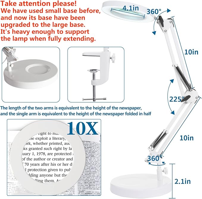 - 2-in-1 Heavy Duty Magnifying Desk lamp & Clamp Light :The magnifier lamp has been upgraded to a sturdy large base whose size is 9.1" ( fully replace the original base that is small ). It is heavy enough to support the lamp when fully extended to make the lamp not flop. It also comes with a metal clamp which can clip the table/ workbench/desktop sturdy. Portable magnifying glass with light to free your hands can point glass and light to the location you need.