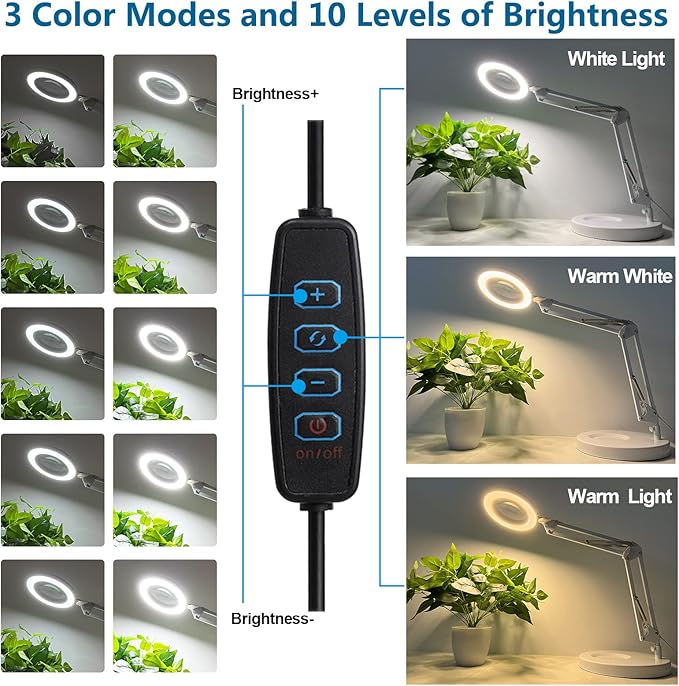 - 3 Lighting Modes & Adjustable lamp: There are 3 different color modes of light (cold light 3000K, natural light 45000K, warm light 6000K), and the brightness of each light modes could also be adjusted (10%-100%). This magnifying glass with light and stand provide perfect lighting for reading, sewing, engraving, facial, jigsaw puzzles and other close work in a comfortable light source.