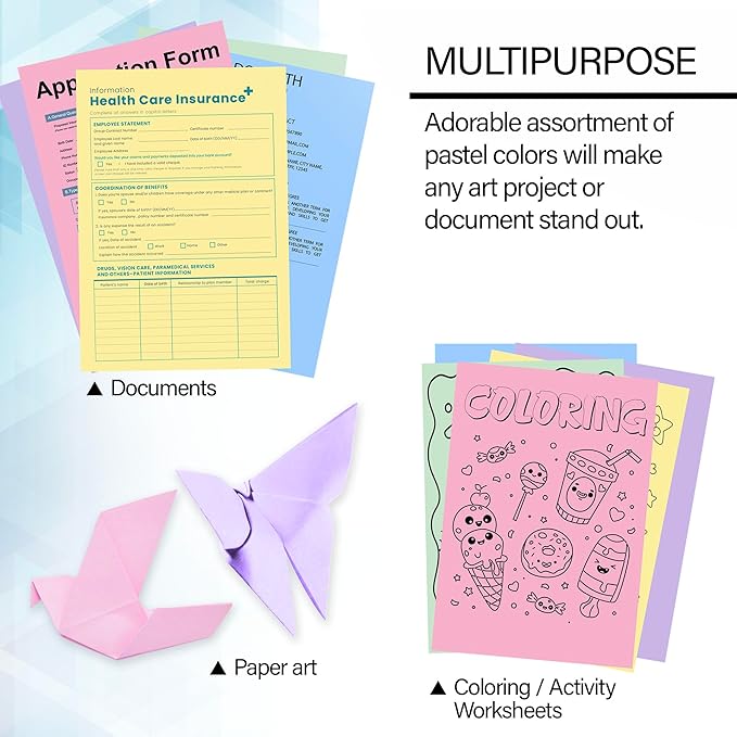 - VIBRANT PASTEL COLORS FOR CREATIVE AND PROFESSIONAL PROJECTS: Add a soft touch of color to every print job with this pastel copy & multipurpose paper. Each sheet enhances crafts, reports, and creative projects with a smooth surface and rich tone. Perfect for classrooms, offices, or home use, this printer paper brings a professional yet artistic finish to your everyday printing needs.
