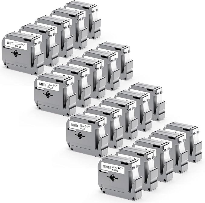 - Include: 20 Pack Compatible with Brother ptouch m tape M-K231 M-K231S M231 MK231 M-231 MK-231 MK label tape 12mm 0.47 black print on white Tape. Width: 1/2" (12mm 0.47 inch ) each. Length: 26.2"(8m) each. Non-laminated m label tape