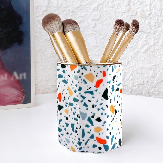Pen Holder, Makeup Brush Holder Ceramic Shiny Gold Terrazzo Marble Stone Pattern Pencil Cup for Girls Kids Women Durable Stand Desk Organizer Storage Gift for Office, Classroom, Home Colorful