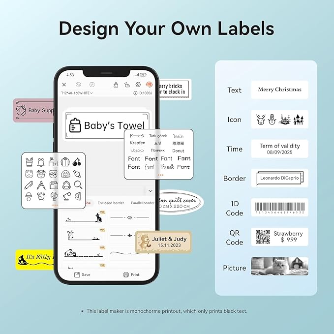 - 【Free APP & Multiple Templates】Our Portable label maker uses exclusive mobile APP to edit, which provides a variety of free templates, allows you to import label text from Excel files, supports printing various texts, numbers, graphics, symbols, logos, barcodes, QR codes Label, etc, provides with smooth printing effects and fast processing.