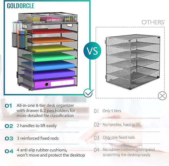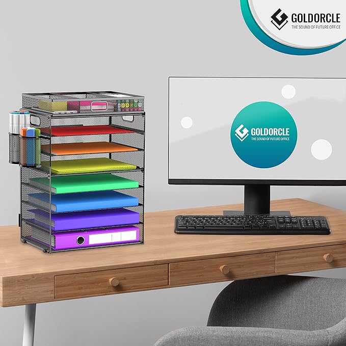 8 Tier Paper Letter Tray Organizer with Drawer & 2 Pen Holders, Mesh Desk File Holder Storage Organization for Home School Classroom & Office