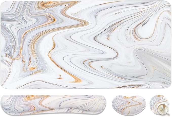 4-in-1 Large Gaming Mouse Pad, Keyboard Wrist Rest Pad & Wrist Support Mousepad Set, Extended Desk Pad Waterproof Desk Mat for Home Office Study Game - White Marble