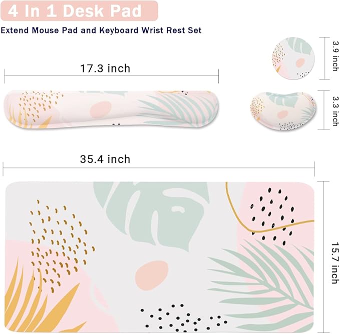 - 【Large and Extended Size】: large desk pad:35.4×15.75 inch, keyboard wrist rest measures 17.32" x 3.15" x 0.98" , Mouse wrist rest measures 5.4" x 3.15" x 0.98". Extended desk pad which is large enough to fit a full-sized keyboard and mouse, providing plenty of space for gaming or office work, and keeping a clean, uncluttered desk.