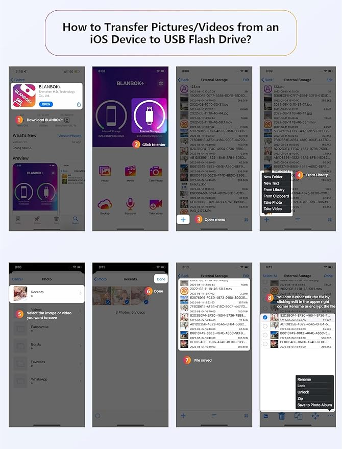 - One-click backup: Plug and play. With this MFI-certified iPhone usb flash drive, you can easily back up photos, videos, and phone book on your phone by One-Click from the APP, and you can also use the USB side to store your own backups on your computer for double insurance.(Tip: iPhone/iPad needs to download "BLANBOK+" APP from APP Store when using jump drive; Android phone needs to turn on OTG function, no need to download APP)