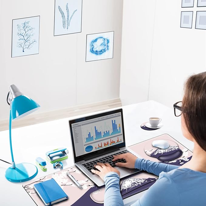 ARTSO Large Mouse Pad Set Ergonomic Keyboard Wrist Rest Support, Memory Foam Gel Wrist Pad, Non-Slip Extended Desk Mat Protector, Pink Sakura Fuji Mountain