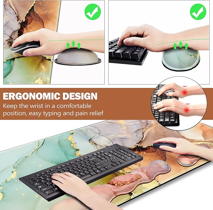- 【4-in-1 Mouse Pad Set】Ergonomic mouse pad includes desk pad (35x15.5inch), keyboard wrist rest(17.3x3.5inch), mouse wrist rest(6.8x3.5inch),free cup coaster(3.9x3.9inch).No need to buy separately, at a super cost-effective price. This desk pad for keyboard and mouse, is large enough to fit your mouse, gaming keyboard, and other desk items. Keep a clean, uncluttered desk. This helps to improve the gaming experience or work efficiency in the office.