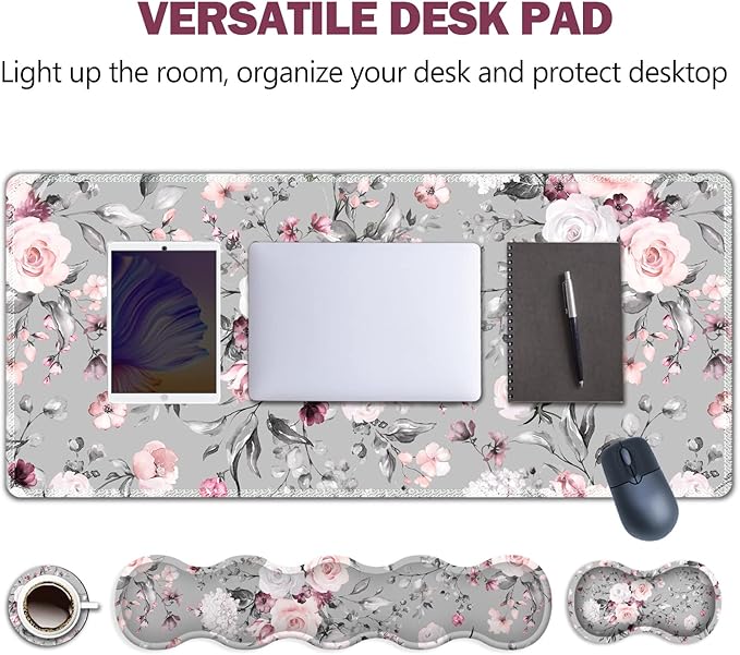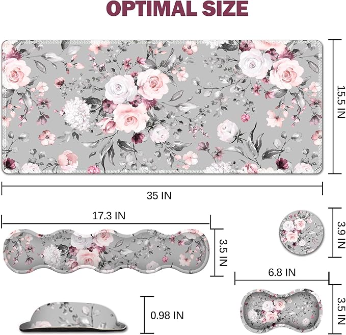 - 【4-in-1 Mouse Pad Set】Ergonomic mouse pad includes desk pad (35x15.5inch), keyboard wrist rest(17.3x3.5inch), mouse wrist rest(6.8x3.5inch),free cup coaster(3.9x3.9inch).No need to buy separately, at a super cost-effective price. This desk pad for keyboard and mouse, is large enough to fit your mouse, gaming keyboard, and other desk items. Keep a clean, uncluttered desk. This helps to improve the gaming experience or work efficiency in the office.