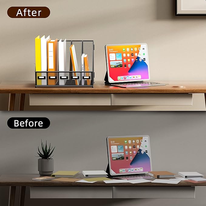 - Space-saving: This file folder organizer has 5 upright dividers for desk storage, taking the best use of vertical space on your desk. If your office space is limited, our desk file organizer can help you get rid of piled of files and have a tidy workplace.
