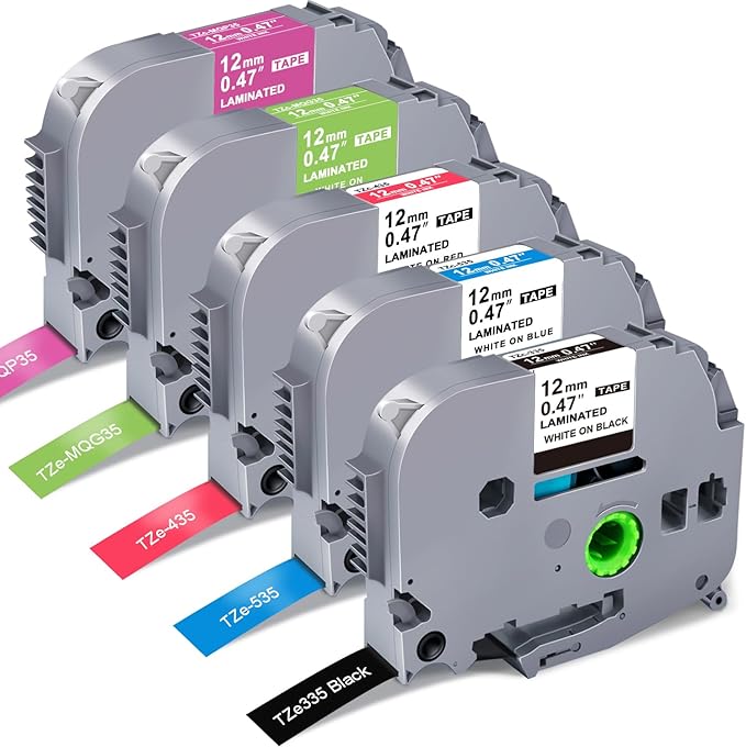 - Width: 1/2 inch (12mm), Length: 26.2 feet (8 meter) each TZe label tape; Color: Multi Color, White on Black (TZe-335), White on Red (TZe-435), White on Blue (TZe-535), White on Berry Pink (TZe-MQP35), White on Lime Green (TZe-MQG35); Standard laminated label tape (Not original)