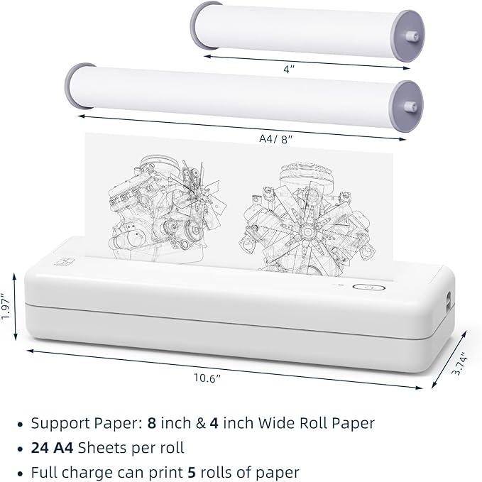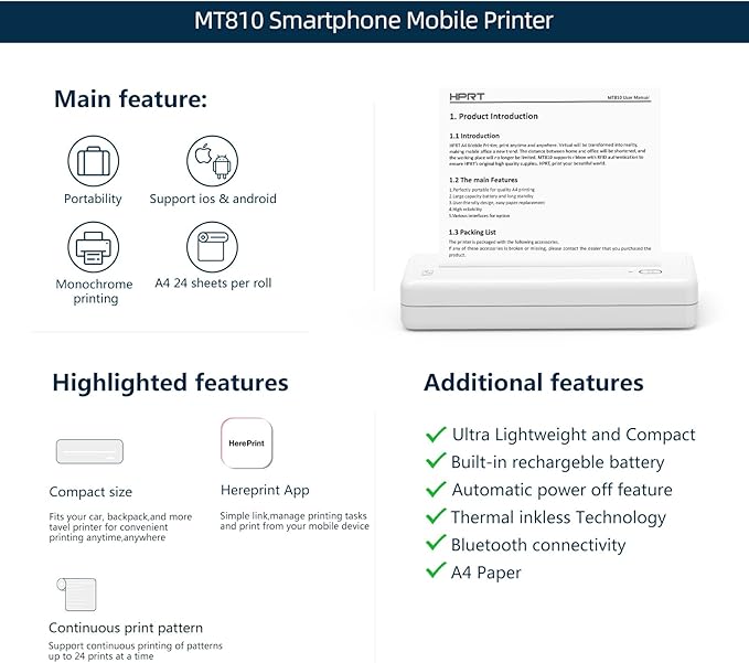 HPRT Wireless Portable Printer - Bluetooth Thermal Printer for Travel, Mobile Office, School, Home Compatible with iOS Android