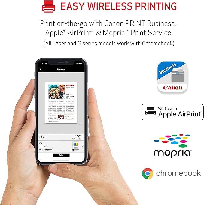 - Print on-the-go with Canon PRINT Business and more using your compatible mobile device