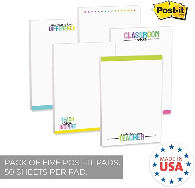 Colorful Teacher Sticky Note Pads / 4" x 6" Repositionable Classroom Sticky Notes / 50 Sheets Per Pad/Set of 5 Designs/Made in USA
