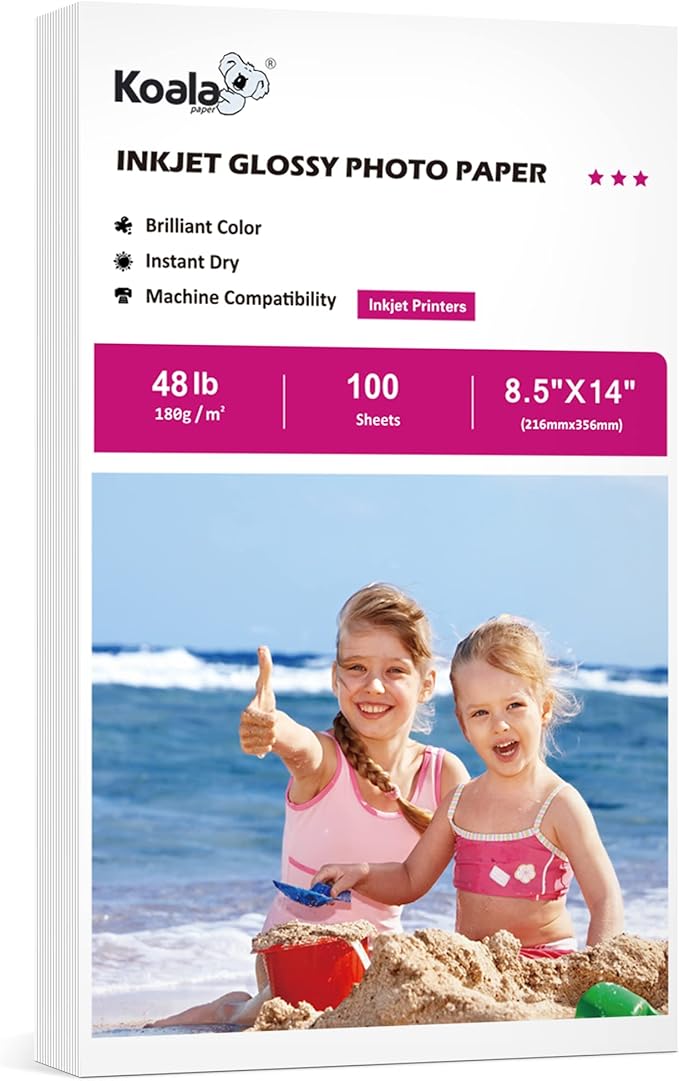 Koala Glossy Inkjet Photo Paper 8.5X14 Inches 48lb 100 Sheets Professional Glossy Photographic Paper Compatible with Inkjet Printer Use DYE INK 180gsm Legal Size