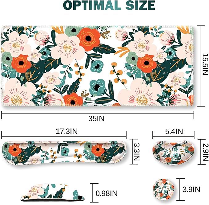 - 【4-in-1 Mouse Pad Set】Ergonomic mouse pad includes desk pad (35x15.5inch), keyboard wrist rest(17.3x3.3inch), mouse wrist rest(5.4x2.9inch), cup coaster(3.9x3.9inch).No need to buy separately, at a super cost-effective price. This desk pad for keyboard and mouse, is large enough to fit your mouse, gaming keyboard, and other desk items. Keep a clean, uncluttered desk. This helps to improve the gaming experience or work efficiency in the office.