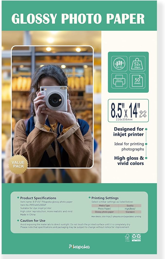 - Pikapoka 8.5x14 glossy photo paper, 50 pack, 52lb/200gsm