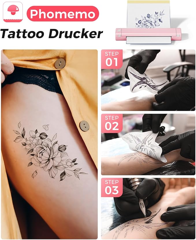 - Powerful Phomemo App : Say goodbye to complicated printing processes - our Phomemo App allows for one-click printing of images and documents. Unlike traditional tattoo printer machine that require printing on white paper before copying, you can print your designs instantly with our app. Plus, for optimal printing results, we recommend using Phomemo Tattoo Transfer Paper.Alternatively, connect to your PC/Laptop via USB cable and print directly. (PC/Laptop printing download the driver: m08f.phomemo.com)