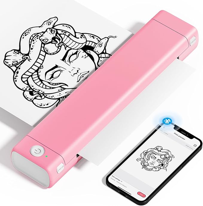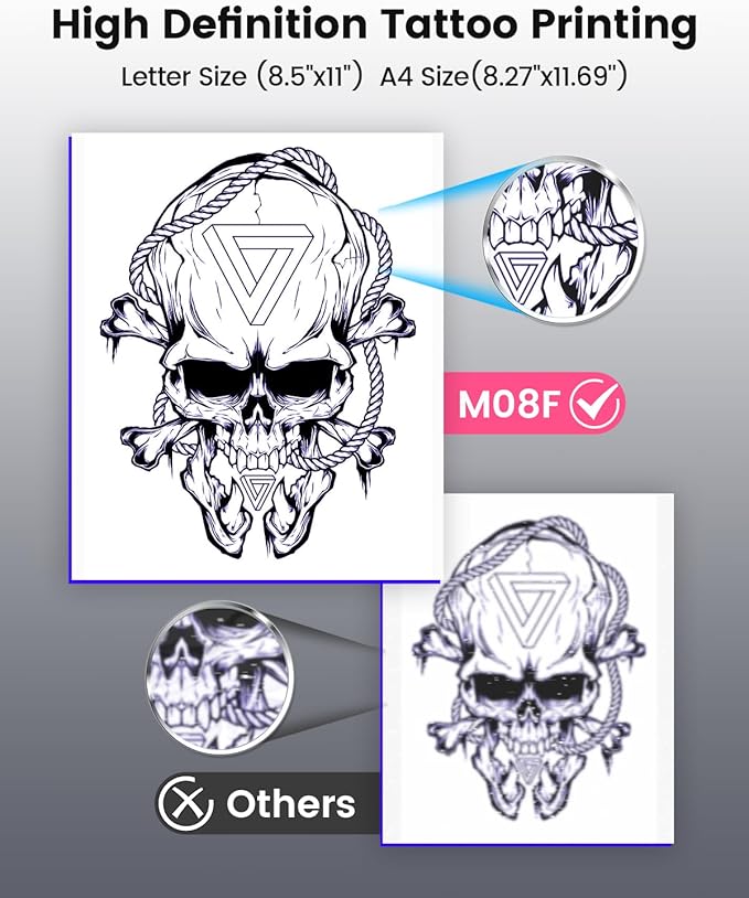 - Phomemo M08F Multi-function Printer : Not only a portable printer but also the latest tattoo stencil printer. The Phomemo tattoo stencil printer features a lightweight and wireless design, weighing just 2 pounds, which is only 60% of the size of traditional tattoo transfer machines. With its built-in rechargeable battery, you don't have to worry about being bound by charging cables, providing unparalleled convenience and ease-of-use for on-the-go professionals and tattoo artists