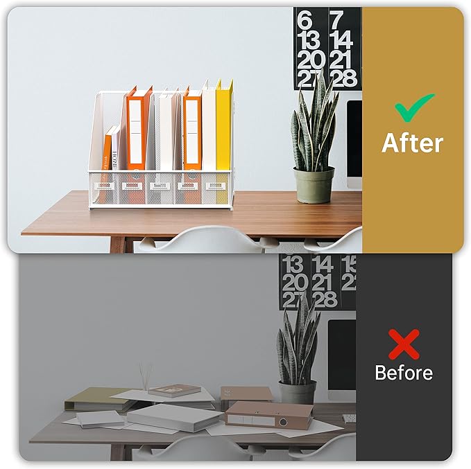 - Space-saving: This file folder organizer has 5 upright dividers for desk storage, taking the best use of vertical space on your desk. If your office space is limited, our desk file organizer can help you get rid of piled of files and have a tidy workplace.