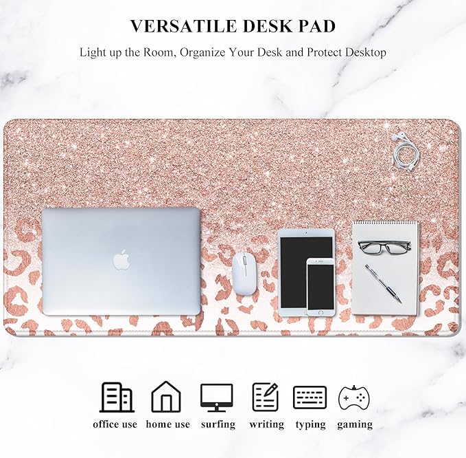 Auhoahsil Large Mouse Pad, XXL Desk Pad, Extened Mousepad 31.5" x 11.8", Non-Slip Rubber Base, Stitched Edges, Superior Surface, Gaming Keyboard Mat, Waterproof Desk Pad, Pink Gold Leopard