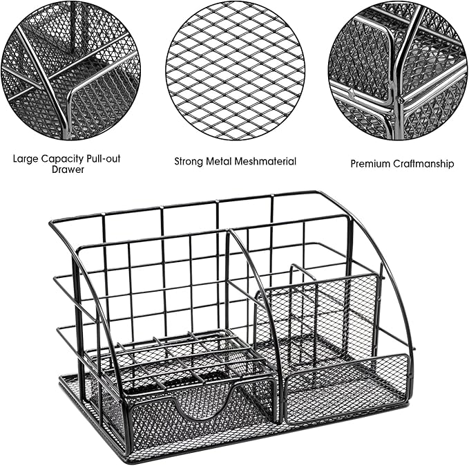 - 【Elegant Desk Organizers】Our cute and stylish desktop organizer features 5 separate compartments and 1 mini sliding drawer. The desktop organizer is adopting with a powder coat finish and electroplating technology ,wear-resistant, anti-oxidation, and long lasting and does not fade . The rounded corners metal rim and trim add to the visual appeal, and protect your desk.