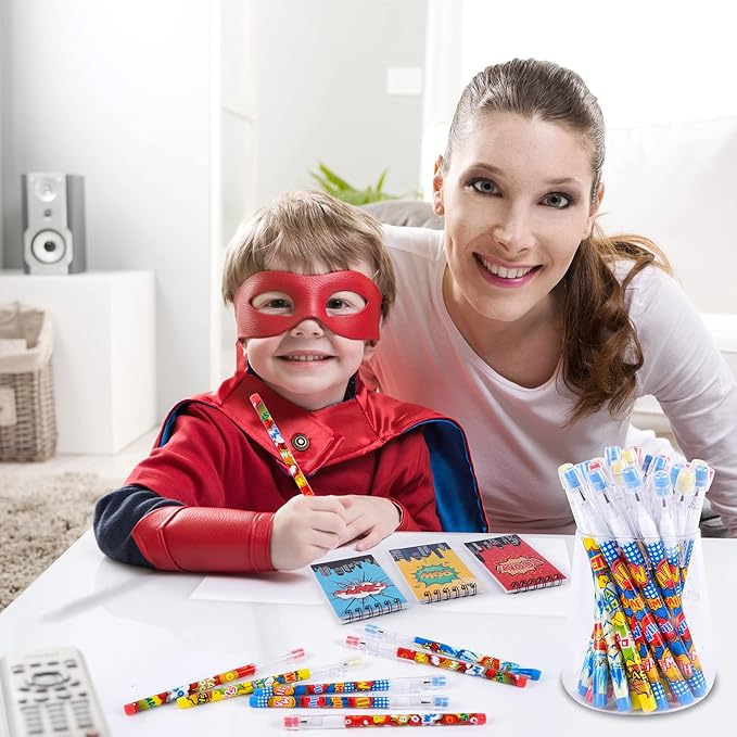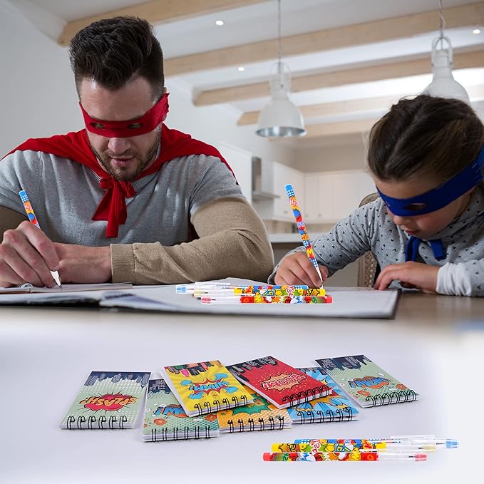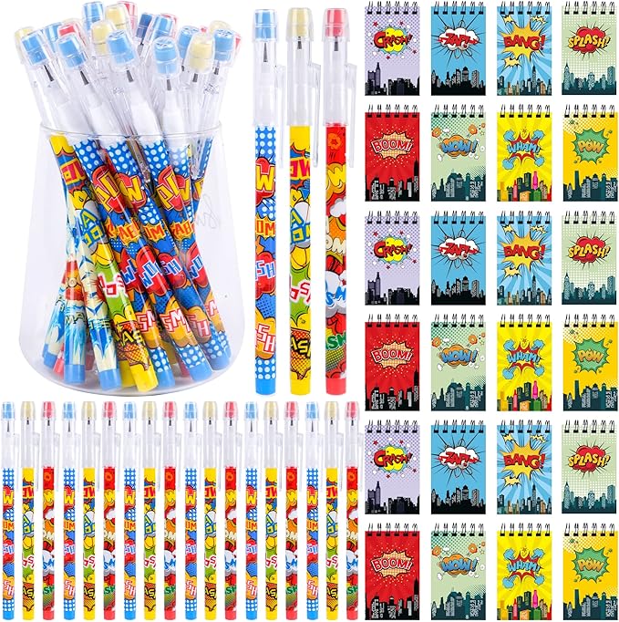 - What You Get: hero birthday party favor supply set includes 24 pieces mini notepads in 8 style and 24 pieces hero text themed pencils in 4 style,enough quantity and colors to meet your need,which will be nice school activities favors or theme party supplies, sufficient quantity to satisfy your daily use; And you can share them with classmates