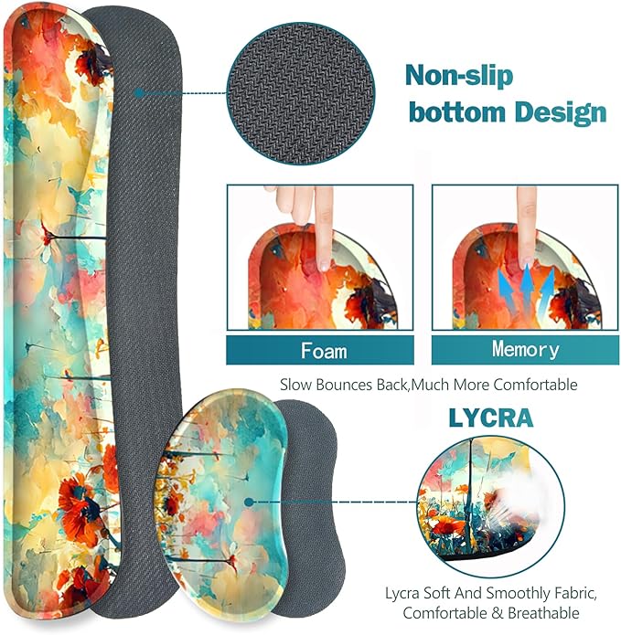 - 【Ergonomic Design】Designed with memory foam and soft smooth material to the pads, lightweight comfortable and durable for your daily work life. This gaming mouse pad wrist support set is contoured ergonomically to keep arms, wrists, and hands from getting sore while working and gaming for long periods of time, maximum reduce wrist stress and tiredness.