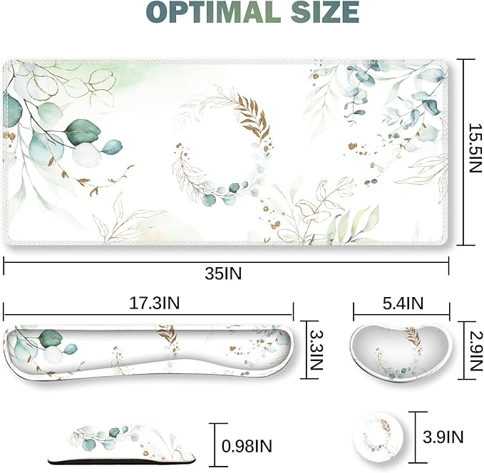 - 【4-in-1 Mouse Pad Set】Ergonomic mouse pad includes desk pad (35x15.5inch), keyboard wrist rest(17.3x3.3inch), mouse wrist rest(5.4x2.9inch), cup coaster(3.9x3.9inch).No need to buy separately, at a super cost-effective price. This desk pad for keyboard and mouse, is large enough to fit your mouse, gaming keyboard, and other desk items. Keep a clean, uncluttered desk. This helps to improve the gaming experience or work efficiency in the office.