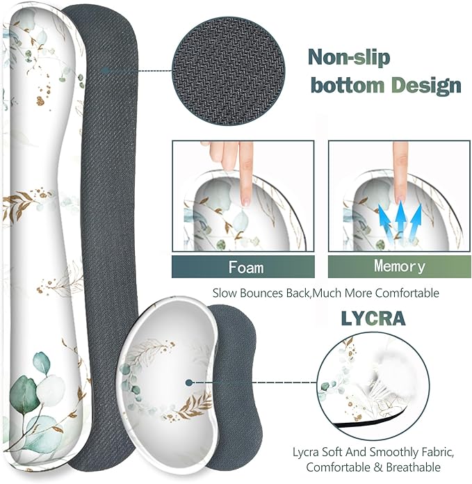 - 【Ergonomic Design】Designed with memory foam and soft smooth material to the pads, lightweight comfortable and durable for your daily work life. This gaming mouse pad wrist support set is contoured ergonomically to keep arms, wrists, and hands from getting sore while working and gaming for long periods of time, maximum reduce wrist stress and tiredness.