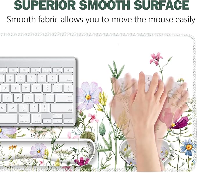 ARTSO Gaming Mouse Pad Wrist Support Set, XXL Large Desk Mat Mousepad + Keyboard Wrist Support+ Mouse Wrist Rest+Coaster 4in1 Ergonomic, Memory Foam for Home Office -White Flowers Plants