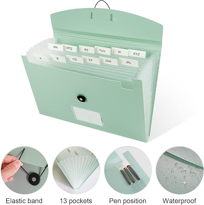 - ✍What's Included: You'll receive one Seige Green 13-pocket expanding file folder measuring 13" x 9.5" x 1.1". This generous size is perfect for storing letters, A4 paper, documents, invoices, contracts, and standard US papers. When fully expanded, it can conveniently hold around 500 letter size sheets.