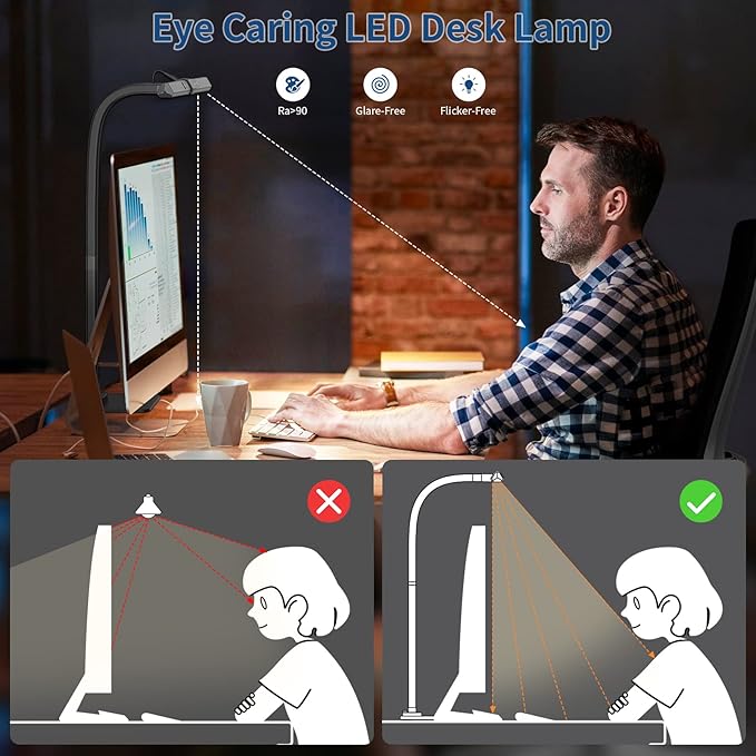 - 1200lm Eye-Caring Task Lamp: Featuring 45-degree angle directionally illuminatination,the right Office Desk Lamp has ability of casting and extending the light to working area without disturbingly hitting your eyes. CRI>90 makes the color more vivid and accurate, creating True-To-Life and comfortable light. No Glare, No Flickering, No shadow, effectively reduces eye fatigue caused by prolonged exposure to light.Feel free to contact customer service with any questions or concerns