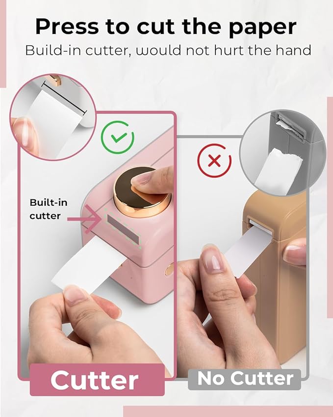 - Innovative Label Maker - 2023 New Design Phomemo D50 thermal label printer with a cutter button, builed-in blade design would not hurt your hand, D50 label machine can identify label sizes and pattern automatically, print more easily and fast