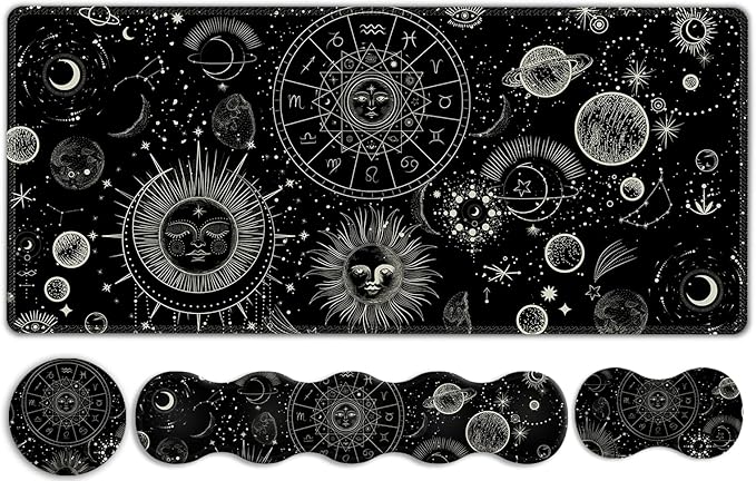 Gaming Mouse Pad Keyboard Wrist Support, 4 in1 Mousepad Set with Wrist Keyboard Rest, Computer Desk Mat, Non-Slip Desk Pad Protector with Memory Foam Easy Typing Pain Relief I Moon Sun Cosmic